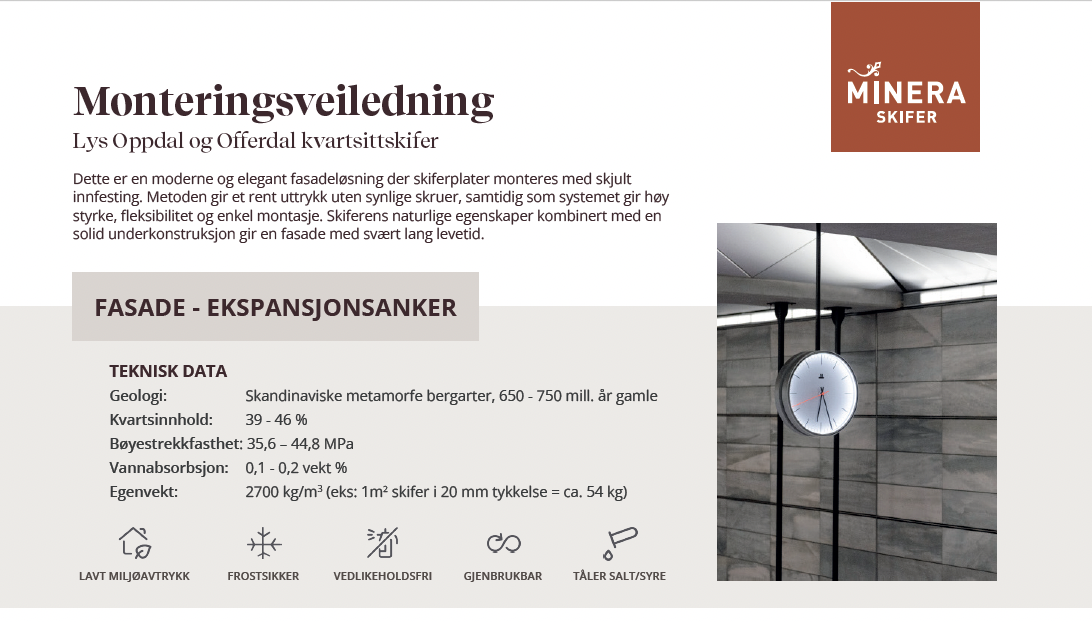 ekspansjonsanker, fasadeinnfesting, fasademontering, fasadeskifer, Installasjonsveiledning, installeringsinstruks, leggeanvisning, leggeveiledning, montering, monteringsanvisning, monteringsinstruks, skiferfasade, skrudd fasade, usynlig