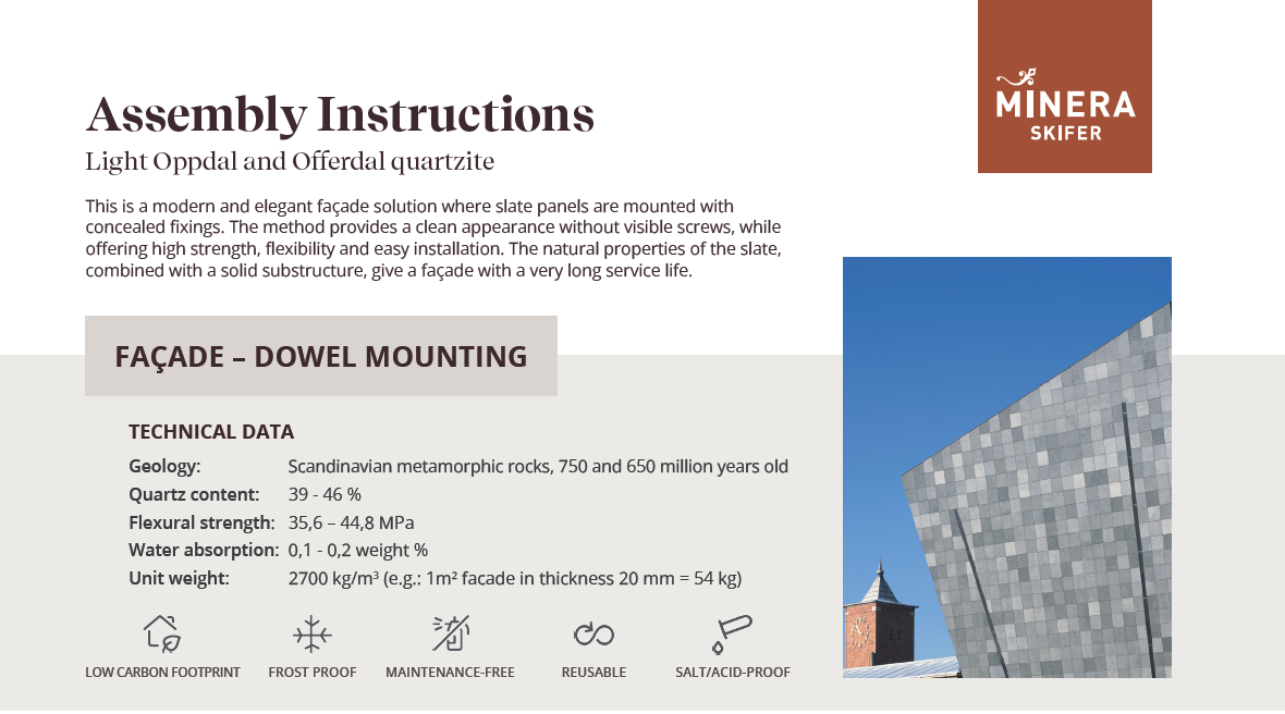 The guide covers slate types and formats, calculation of quantities, weight, build-up, and the method for concealed fastening of slate with dowels. Illustrations support the written guidance.